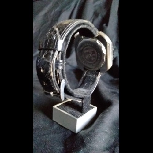 Boîtier en acier, fond vissé, cadran noir avec index alternés bâtons & gros points luminescents, date positionnée à 4 heures, aiguilles courtes, lunette double rotative, grise avec échelle tachymétrique et noir avec les villes du monde pour fonction GMT, à l'intérieur d'un réhaut tournant avec les secteurs des 5 dernières minutes utilisés dans les compétitions de voile.