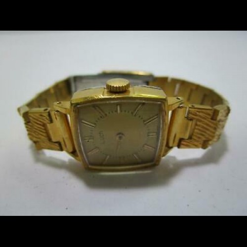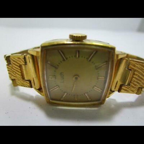 Voici une soviétique vintage Luch Or montre Pour les femmes qui remonte aux années 1960. Le tons d'or de l'ère soviétique montre présente un très intéressant et élégant montre cadran. Les marqueurs d'heure sont divisés en 4 pièces et créent un motif symétrique sur le cadran.