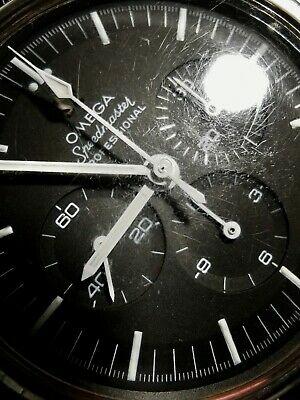 De là, nous voyons qu'il avait le cadran noir étagé avec des marqueurs d'heure au tritium lume qui courent tout au long de la minute et le logo Omega appliqué et le mot "Professional" répertorié dans la configuration à trois lignes.