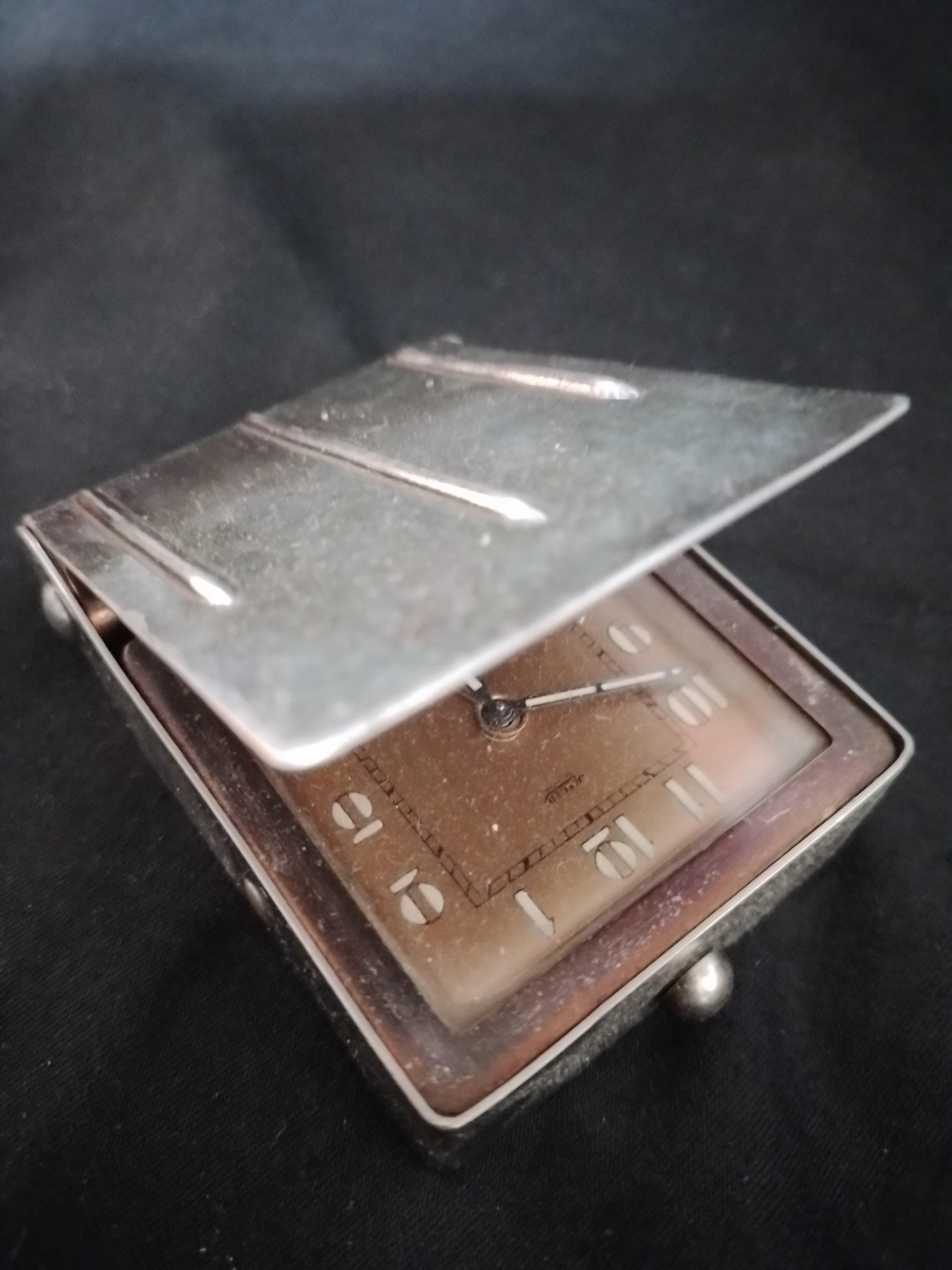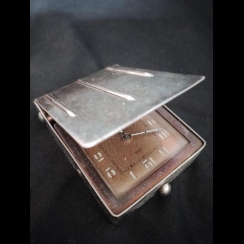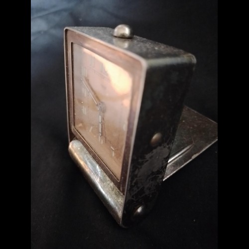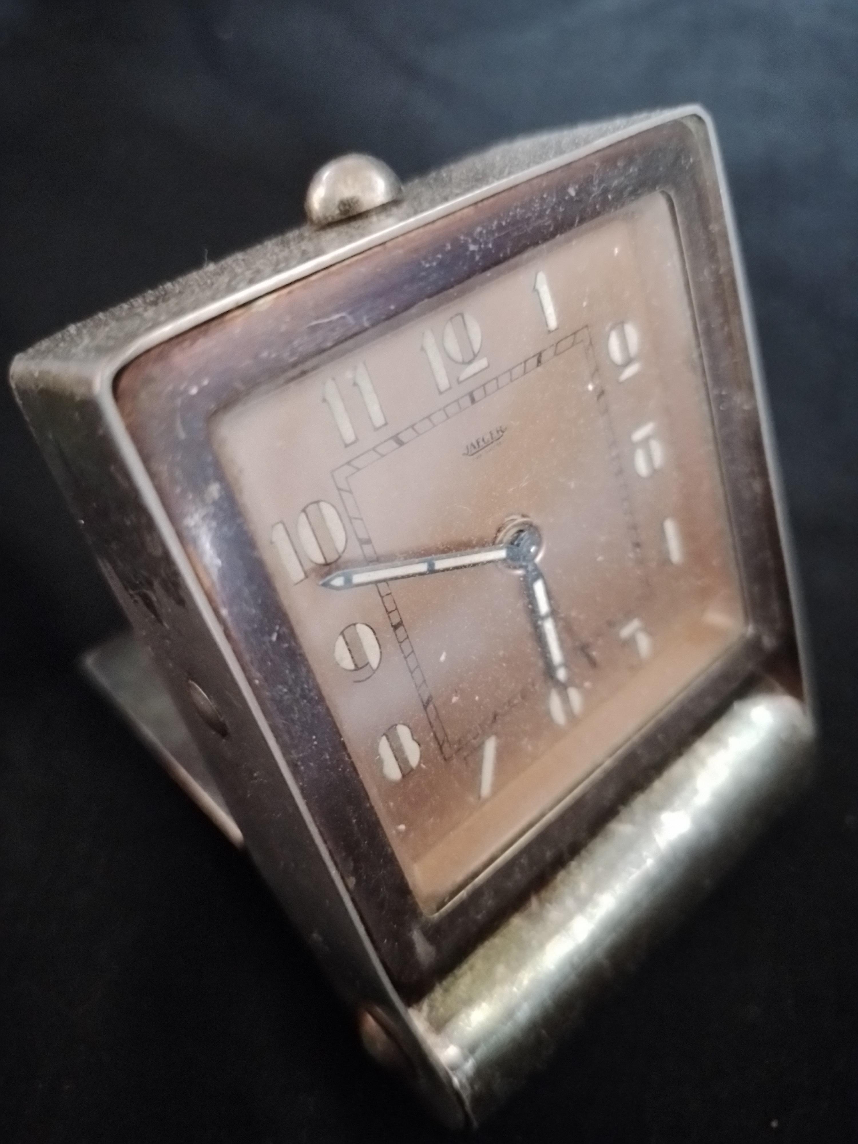 C’est le cas avec cette pendulette de table Jaeger 2 jours en métal cuivré, au format carré idéal de voyage et dévoilant un magnifique cadran finition lin à la belle simplicité.