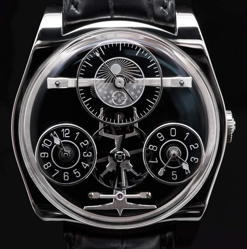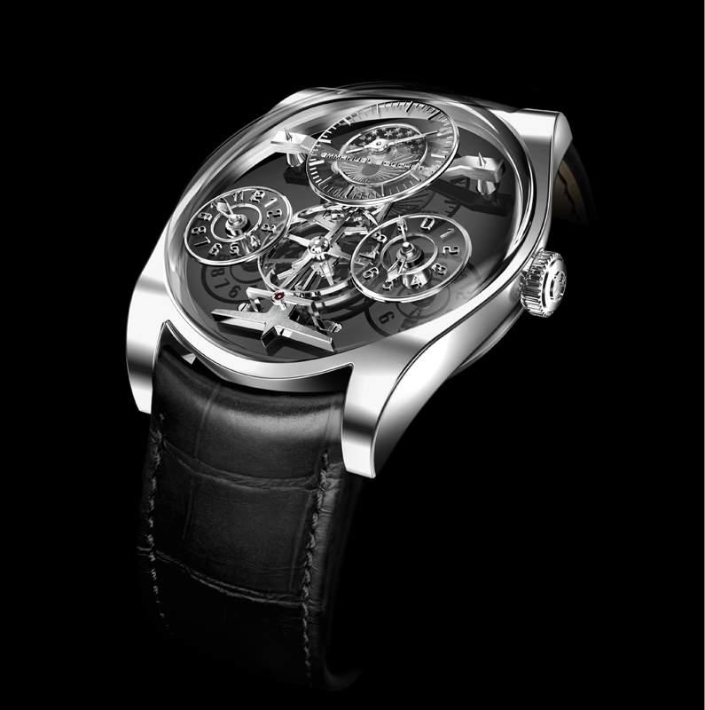 Chaque détail a été pris en compte, de l’excellence mécanique à l’esthétique en passant par les finitions. Le cadran en onyx noir reçoit sous une forme architecturale d’autres cadrans en disques saphir et ce sur plusieurs niveaux, ceux-ci semblent flotter dans un espace 3D.