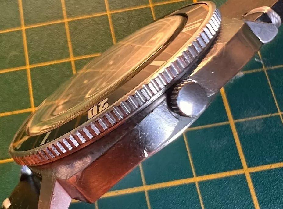 Et tandis que la lunette des vraies montres de plongée de Seiko avait des finitions plates et était marquée par incréments d'une minute tandis que le reste de l'échelle était marqué par points d'incrémentation de cinq minutes pour suivre avec précision chaque minute passée sous l'eau ; la lunette du Poor Man a une finition brillante et raffinée, n'est que peu marquée à intervalles de cinq minutes seulement et est incliné légèrement.