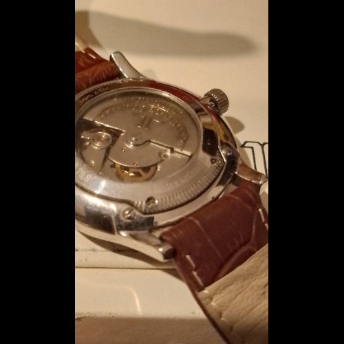 Cadran argenté, chiffres et index rhodiés. Aiguilles : alpha. Fonctions : heure-minute, seconde, 2éme fuseau horaire, indiateur des 24 heures et date.