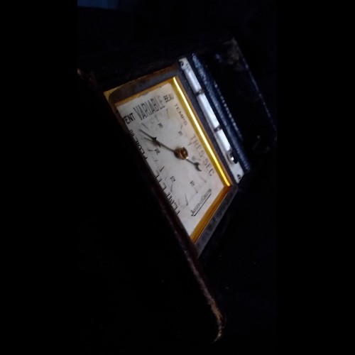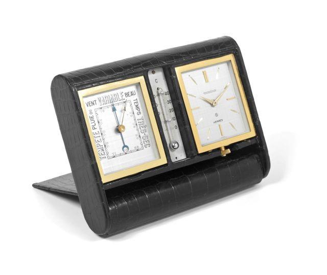 Élégant, rare et intéressant réveil de voyage baromètre-thermomètre en métal doré gainée de cuir.