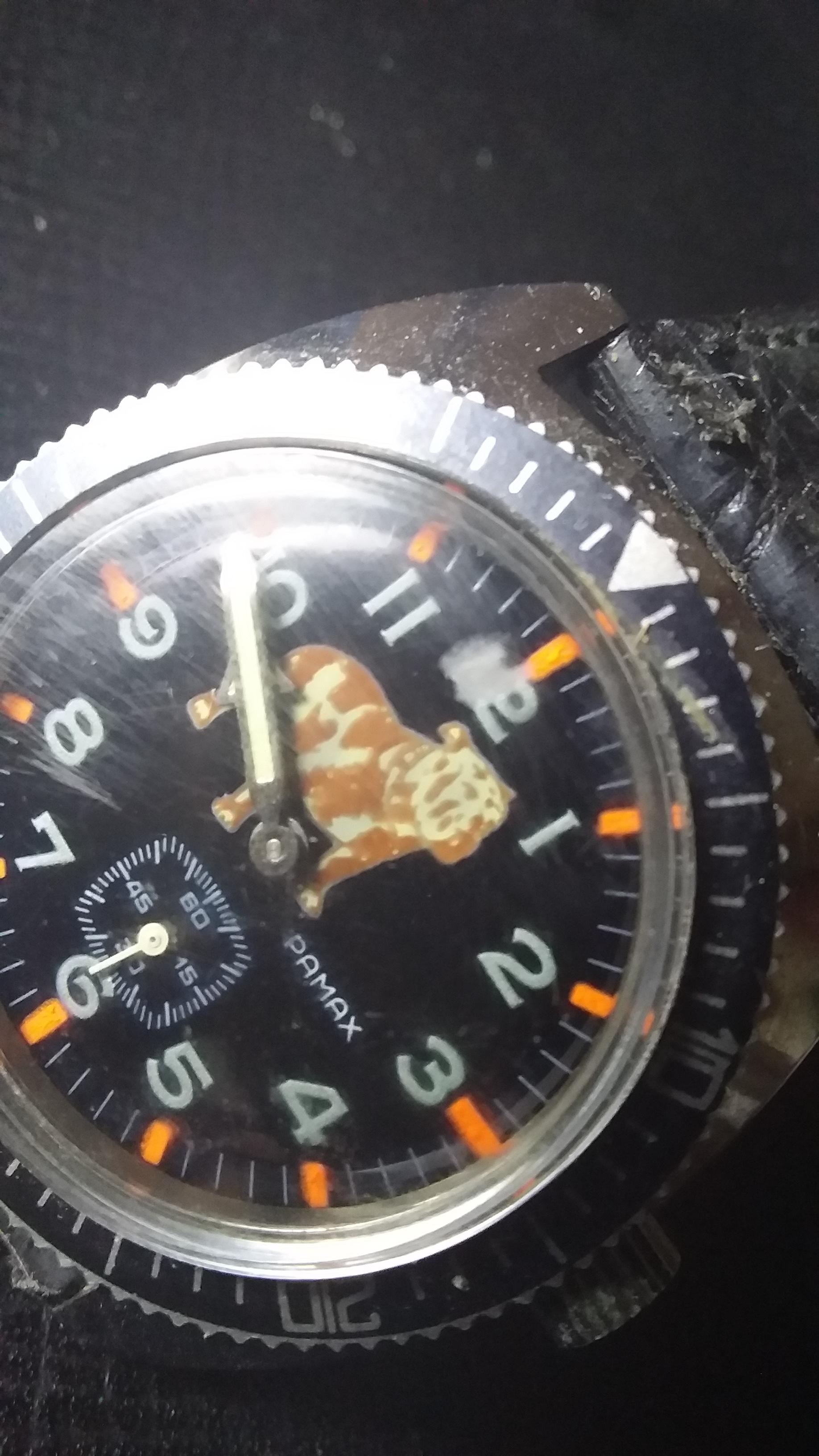 Montre nommé Pamax, avec un tigre dessiné à la place du logo, de la marque habituelle !