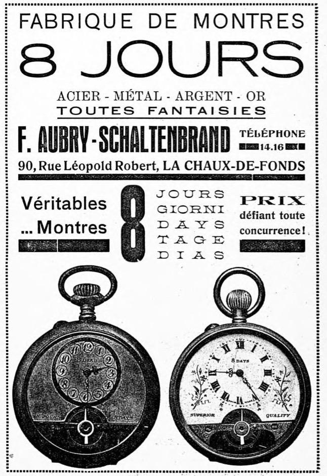 Cette publicité montre Francis Aubry Schaltenbrand comme nouveau producteur de montres 8 jours de la Chaux-de-Fonds après le départ à la retraite d'Irenée Aubry.
