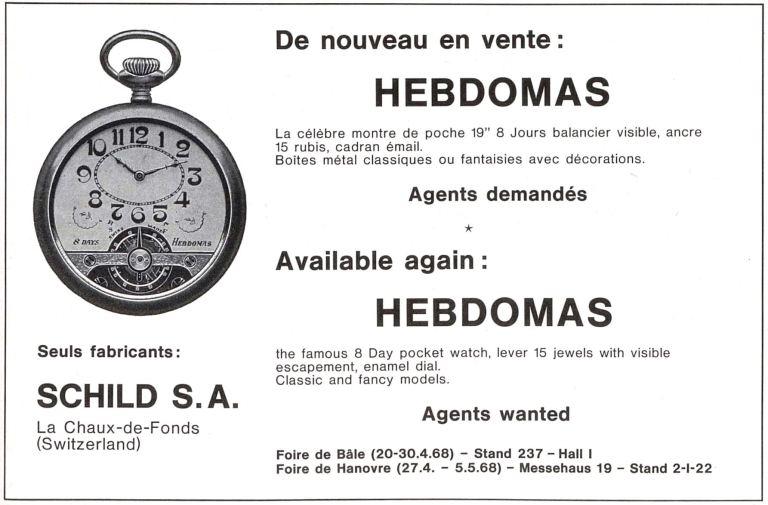 Lors de la Foire de Bâle en 1968, la société (aujourd'hui connue sous le nom de Schild SA) a relancé « la fameuse montre de poche 8 jours » comme elle l'avait toujours fait. Mis à part quelques chiffres groovy et une minuterie ovale, la nouvelle Hebdomas était en grande partie inchangée.