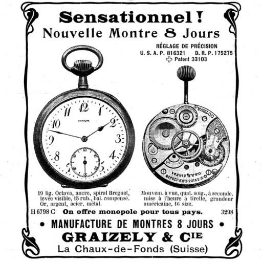 En 1909, Graizely a commencé à produire l'Octava, une montre alternative de 8 jours en plus du design familier d'Aubry à balancier ouvert.