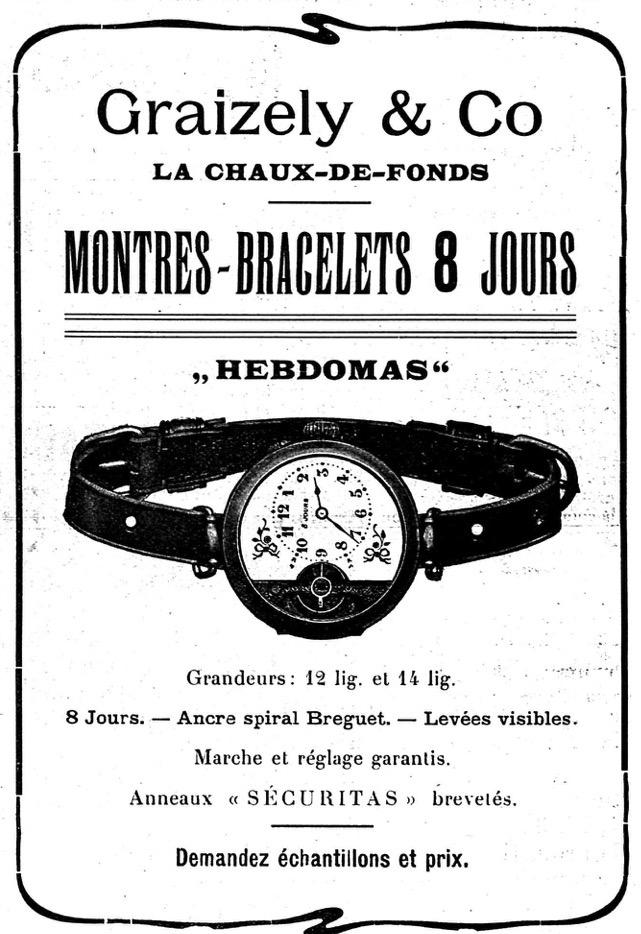 Cette remarquable publicité de 1912 est la première utilisation connue du mot « Hebdomas » en association avec la montre 8 jours produite par Graizely & Co. C'est aussi un remarquable exemple précoce de montre-bracelet pour homme !
