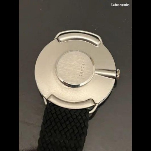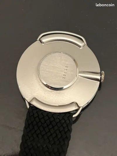 Montre d’homme avec boîte chromée mat et fond acier. Mouvement mécanique à remontage manuel LIP T13. Lunette hublot, cadran gris index imprimés argentés, aiguilles bâtons, vis apparentes. Très rare bracelet maille milanaise d’origine, avec référence du modèle encore présente. Design par Marc Held Année 1975. Numérotée 011133.