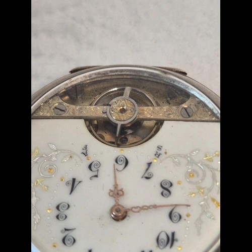 De style Hebdomas 8 jours, pas de marque sur la montre. Beau cadran en émail à motif Floral, mouvement, échappement et balancier visible en bas du cadran.