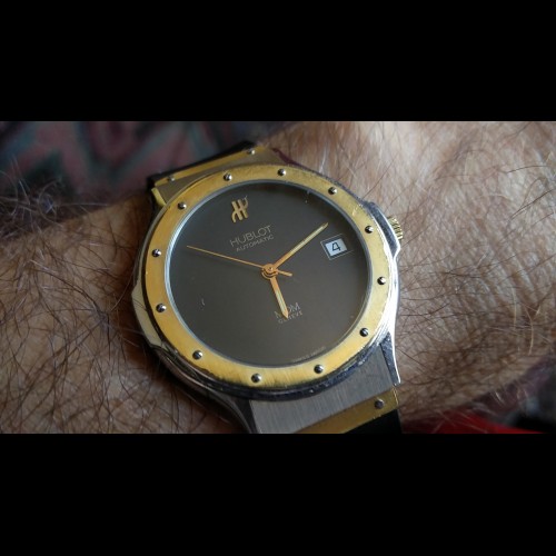 Le MDM a disparu de la désignation, mais cette Hublot Geneve (réf. 1395.NE10.2) vaut le détour. Le boîtier en acier est mis en valeur par la couronne, la lunette et les attaches du bracelet en or jaune. Les index linéaires complètent idéalement l’image d’ensemble. Vous pouvez acheter la référence avec les papiers et la boîte d’origine à un prix raisonnable de 2 450 €.